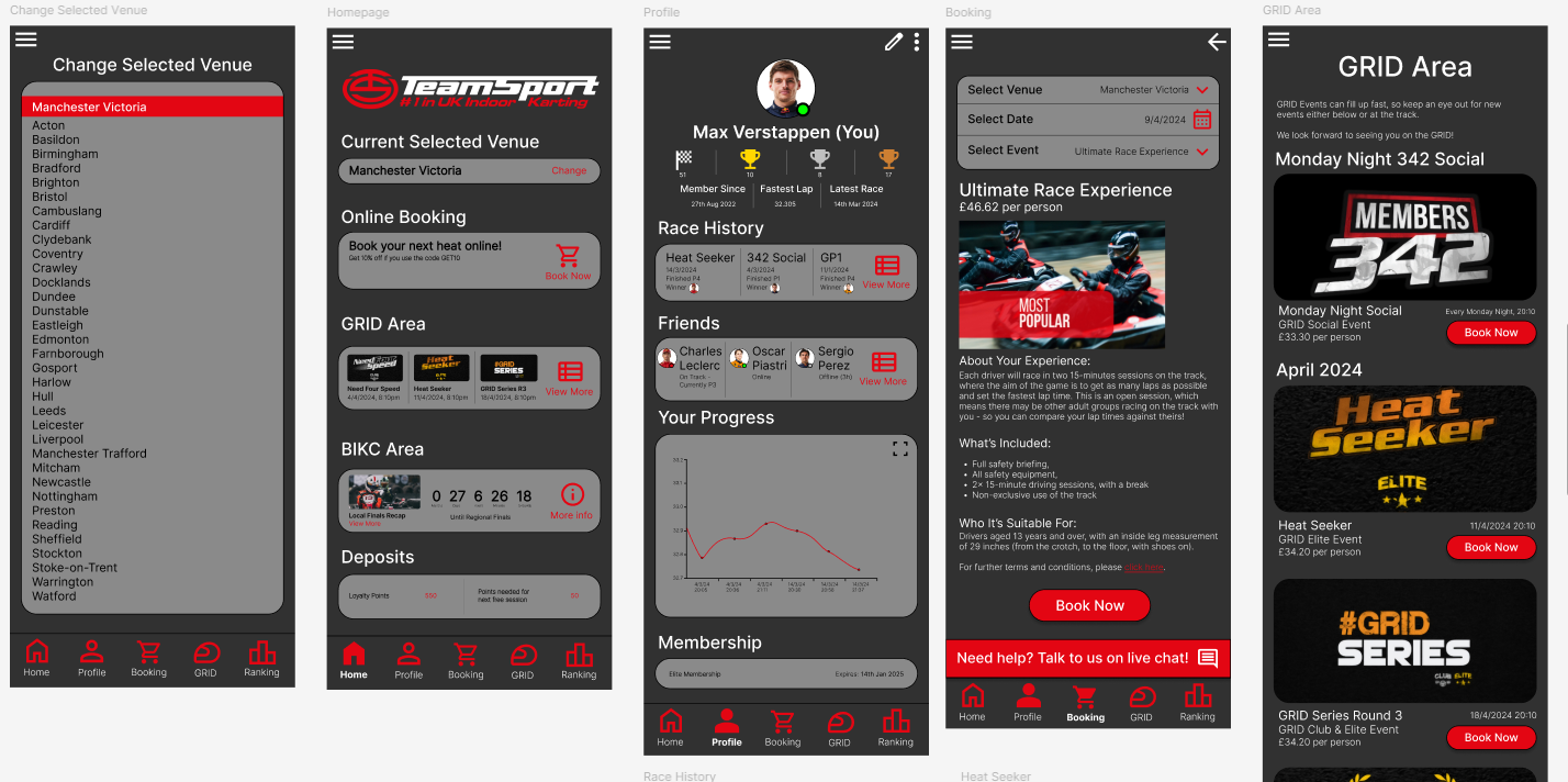 As part of a university project, I redesigned the app of TeamSport- the UK’s largest indoor go-karting company. This included taking weak elements of the current app, and improving on them, as well as adding new ideas of my own. Below are the Figma links: